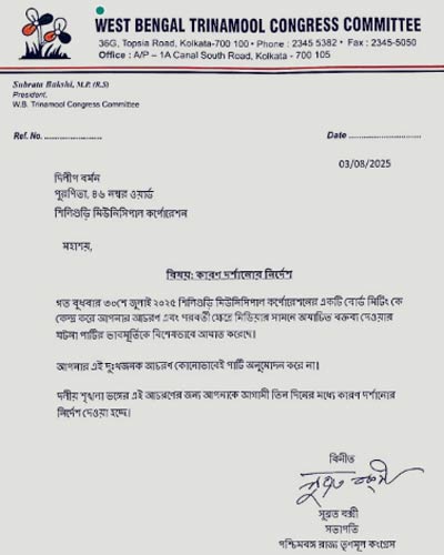 এতেই খেপে ওঠেন দিলীপ বর্মন। তাঁর অভিযোগ, রাজবংশী বলে তাঁকে এভাবে অপমান করা হল। এর প্রতিবাদে পরেরদিন তিনি রাস্তা অবরোধ করেন। মেয়র সম্পর্কে আপত্তিজনক মন্তব্যও শোনা যায় তাঁর মুখে। দলের শীর্ষ নেতৃত্বের কানে এ খবর পৌঁছয়। প্রসঙ্গত, শনিবারই দার্জিলিংয়ের তৃণমূল সংগঠনের দায়িত্বে গড়ে দেওয়া হয়েছে কোর কমিটি। সেই কোর কমিটির সদস্যদের অভিযোগের ভিত্তিতে দলের রাজ্য সভাপতি সুব্রত বক্সি শোকজ নোটিস পাঠিয়েছেন দিলীপ বর্মনকে। লিখেছেন, ”গত ৩০ জুলাই বোর্ড মিটিংয়ে আপনার আচরণ এবং পরবর্তীকালে মিডিয়ার সামনে আপনার অযাচিত বক্তব্য পার্টির ভাবমূর্তিকে বিশেষ ভাবমূর্তিকে বিশেষভাবে আঘাত করেছে। দলীয় শৃঙ্খলাভঙ্গের এই আচরণের জন্য আপনাকে তিনদিনের মধ্যে কারণ দর্শানোর নির্দেশ দেওয়া হচ্ছে।”