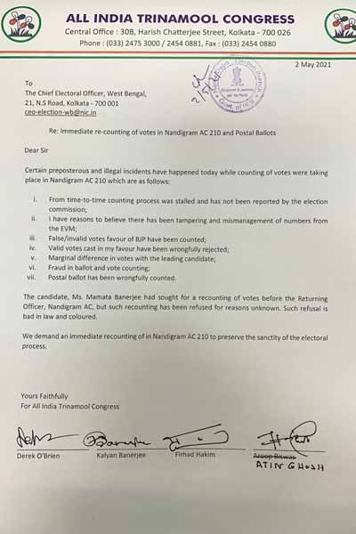 রাত ৯.৩৪: নন্দীগ্রামের গণনায় কারচুপি নিয়ে নির্বাচন কমিশনে চিঠি দিল তৃণমূল।