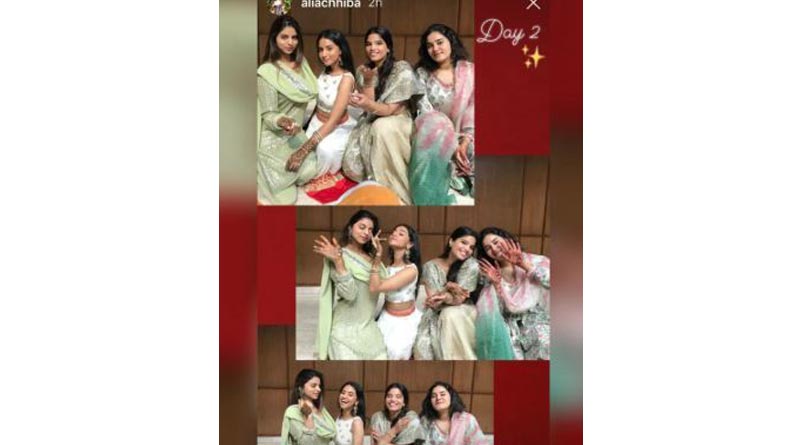 সম্প্রতি, সাত পাকে বাঁধা পড়লেন গৌরীর ভাই বিক্রান্তের মেয়ে আলিয়া। আর মামার মেয়ের বিয়েতে উপস্থিত থাকতেই সুহানা মায়ের সঙ্গে হাজির হয়েছেন কলকাতায়। দিন দুয়েকের জন্য ছুটি কাটাতে এসেছেন আর কী কলকাতায়! সম্প্রতি, গৌরীই নিজের সোশ্যাল মিডিয়ায় ছবি পোস্ট করে ফাঁস করেছেন এখবর। ওই ছবিতে ভাই বিক্রান্ত এবং আরও দুই আত্মীয়ার সঙ্গে গৌরীকে দেখা গিয়েছে। লাল শাড়িতে দিব্যি লাগছিল দেখতে শাহরুখঘরনি গৌরীকেও। তবে, মেয়ে সুহানাও কম যান না। এথনিক পোশাকে নজর কেড়েছেন তিনিও। কনে আলিয়াই সুহানার সঙ্গে ছবি পোস্ট করেছেন নিজের সোশ্যাল মিডিয়ায়। সেখানেই জলপাই রঙের শাড়িতে দেখা গিয়েছে শাহরুখকন্যাকে। ঝুমকো জোড়া, হালকা মেক-আপ, হাতে মেহেন্দি- এহেন অবতারেই নেটিজেনদের নজর কেড়েছেন সুহানা। অনায়াসে কোনও ফ্যাশেনিস্তাকেও দু’চালে কিস্তিমাত করতে পারেন তিনি। মেহেন্দি অনুষ্ঠানেও সুহানাকে দেখা গিয়েছে পেস্তা রঙের সালোয়ারে।