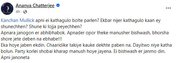 তারকা বিধায়ককে স্পষ্টই অনন্যা আরও লিখলেন, “আপনারা জনগণের অভিভাবক। আপনাদের উপর থেকে মানুষের বিশ্বাস, ভরসা সরে যেতে দেবেন না এই ভাবে। একা হয়ে যাবেন এক দিন। চার দিকে তাকিয়ে কাউকে দেখতে পাবেন না। দায়িত্ব নিয়ে কথা বলুন। রাজনীতি করলেই মানুষ খারাপ হয়ে যায় না। এই বিশ্বাসের জন্ম দিন। আপনি জননেতা।”