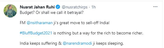 মঙ্গলবার টুইটারে একটি ভিডিও শেয়ার করেছেন নুসরত। যাতে নির্মলা সীতারমণের পেশ করা বাজেট নিয়ে বিদ্রুপ করা হয়েছে। এরই ক্যাপশনে অভিনেত্রী সাংসদ লেখেন, “বাজেট? নাকি আমরা এটাকে বিশ্বাসঘাতকতা বলব? কেন্দ্রীয় অর্থমন্ত্রী নির্মলা সীতারমণজি’র দেশকে বেচার দারুণ একটা কৌশল।” এরপরই “ব্লাফ বাজেট ২০২১” (Bluff Budget 2021) হ্যাশট্যাগ দিয়ে আবার লেখেন, “এই বাজেট শুধু ধনীদের আরও ধনী করার উপায়। ভারতবর্ষ এখনও যন্ত্রণা ভোগ করছেন আর নরেন্দ্র মোদিজি ঘুমোচ্ছেন।”