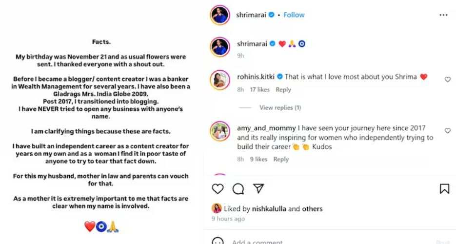 ঠিক কী লিখেছেন বচ্চনবধূর ভাইয়ের বউ শ্রীমা? পোস্টে তিনি লেখেন, ‘২১ নভেম্বর আমার জন্মদিন ছিল এবং যথারীতি আমাকে যাঁরা ফুল পাঠিয়েছেন বা শুভেচ্ছা জানিয়েছেন, তাঁদের সকলকে আমি ধন্যবাদ জানাই। ব্লগার হওয়ার আগে আমি বেশ কয়েক বছর ধরে ব্যাঙ্কে কাজ করেছিলাম। আমি গ্ল্যাড্র্যাগস মিসেস ইন্ডিয়া গ্লোব ২০০৯ও হয়েছি। ২০১৭ সালের পরে, আমি ব্লগ করা শুরু করি। আমি কোনোদিনই কারও নাম ভাঙিয়ে কোনও ব্যবসা খোলার চেষ্টা করিনি। ধোঁয়াশা পরিষ্কার করার জন্য সত্যি কথাগুলো বললাম। নিজের চেষ্টায় কন্টেন্ট ক্রিয়েটার হিসেবে কেরিয়ার গড়েছি। তাই আমার জীবনের কসরতটাকে হেয় করায় একজন মহিলা হিসেবে কষ্ট পেলাম। আমার স্বামী, শাশুড়ি এবং আমার বাবা-মা সকলেই জানেন একথা। তাই একজন মা হিসেবে, এটা আমার কাছে অত্যন্ত গুরুত্বপূর্ণ যে যেখানেই আমার নাম জড়াবে সেই ঘটনাগুলো পরিষ্কার করা দরকার।’ সেখান থেকেই গুঞ্জনের সূত্রপাত যে বাপের বাড়িতেও সম্ভবত বনিবনা হচ্ছে না ঐশ্বর্য রাইয়ের।