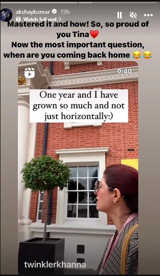 ইনস্টা স্টোরিতে জীবনের এই নতুন ইনিংসের খবর দিয়েছেন টুইঙ্কল খান্না আর সেটা শেয়ার করেই অক্ষয়ের মন্তব্য, “মাস্টার্স করে ফেললে, কীভাবে!! খুব খুব গর্ব হচ্ছে টিনা তোমার জন্য। তবে এবার সবথেকে গুরুত্বপূর্ণ প্রশ্ন হচ্ছে, বাড়ি কবে ফিরছ তুমি?” এই মেসেজের সঙ্গে হাসি আর লাভ ইমোজি জুড়ে দিলেন বলিউড খিলাড়ি।