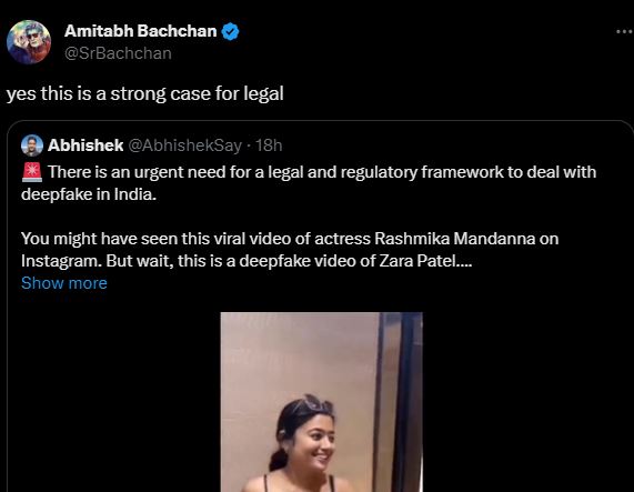 উল্লেখ্য়, ‘গুডবাই’ ছবিতে সিনিয়র বচ্চনের সঙ্গে স্ক্রিনস্পেস শেয়ার করেছেন রশ্মিকা মন্দানা। অভিনেত্রীর হয়ে এবার আইনি পদক্ষেপের দাবি তুললেন অভিভাবকসম বচ্চন। অমিতাভের দাবি, “এই বিকৃত ভিডিওর নেপথ্যে যে, তার বিরুদ্ধে কড়া আইনি পদক্ষেপ নেওয়া উচিত।”