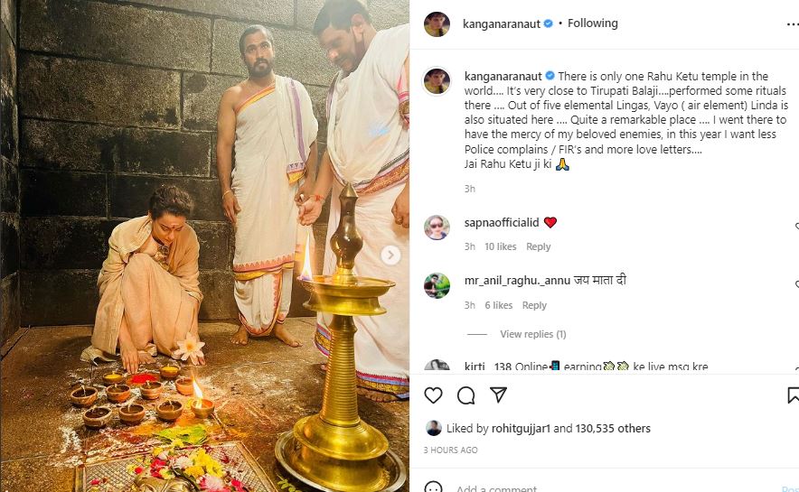 বছরের প্রথম দিন অনুরাগীদের নতুন বছরের শুভেচ্ছা জানিয়ে কঙ্গনা সোশ্যাল মিডিয়ায় লিখলেন, ‘গোটা বিশ্বে একমাত্র রাহু ও কেতুর মন্দির রয়েছে তিরুপতি মন্দির থেকে ঢিল ছোঁড়া দূরত্বে। এই মন্দিরে এসে পুজো দিলাম। আমার শত্রুদের হয়ে ভগবানের কাছে প্রার্থনা করে এলাম। আমার একটাই প্রার্থনা নতুন বছরে আমি যেন বেশি এফআইআর না পাই, বরং তার বদলে আমাকে প্রেমপত্র পাঠান!’