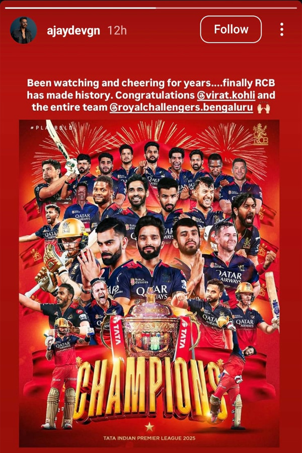 এদিকে অজয় দেবগণের মতো সিনিয়র অভিনেতাও বিরাট ও তাঁর দলকে শুভেচ্ছা জানিয়েছেন সোশাল মিডিয়ায়। ক্যাপশনে লিখেছেন, ‘আঠারো বছর ধরে দলের জন্য গলা ফাটাচ্ছি, অবশেষে ইতিহাস তৈরি হল। অনেক অভিবাদন বিরাট কোহলি ও টিম আরসিবিকে।’
