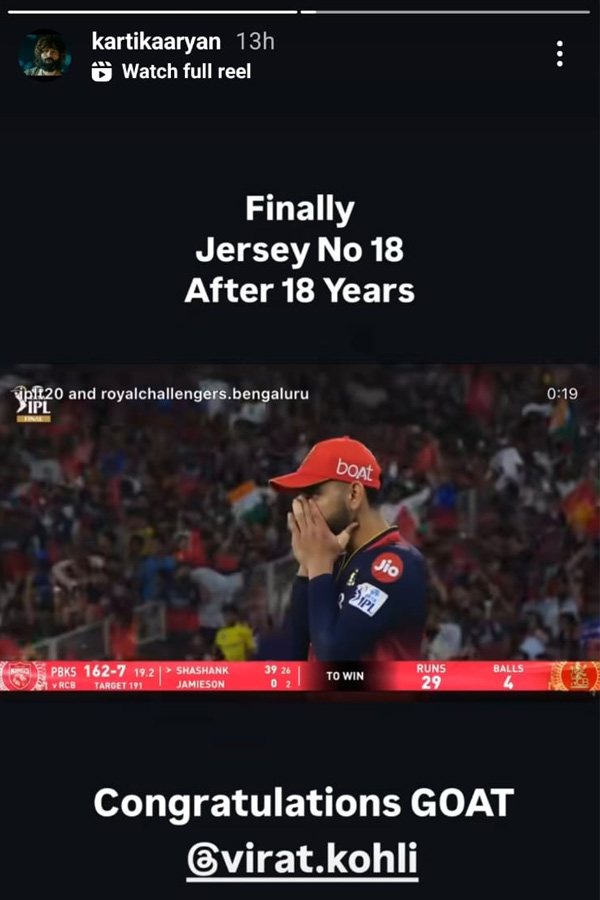বলিউডের ‘রুহ বাবা’ কার্তিক আরিয়ানও বাদ যাননি। সোশাল মিডিয়ায় তিনি শুভেচ্ছা জানিয়ে লিখেছেন, ‘অবশেষে, ১৮টা বছর পর জার্সি নম্বর ১৮।’