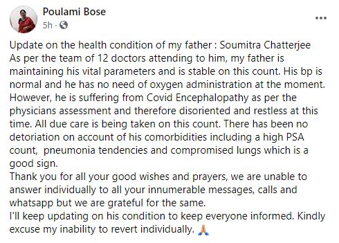 গত মঙ্গলবার কিংবদন্তি অভিনেতার কোভিড (COVID-19) পজিটিভ হওয়ার কথা জানা যায়। শোনা গিয়েছে, বেশ কয়েকদিন ধরেই অসুস্থ ছিলেন সৌমিত্র চট্টোপাধ্যায়। চিকিৎসকের পরামর্শে তাঁর করোনা পরীক্ষা করানো হয়। পরীক্ষার ফল পজিটিভ আসে। এরপরই মধ্য কলকাতার বেলভিউ ক্লিনিকে ভরতি করা হয় প্রবাদপ্রতীম শিল্পীকে। শুক্রবার বিকেল পর্যন্ত খবর ছিল ভালই আছেন ৮৫ বছরের অভিনেতা। বৃহস্পতিবারও তাঁর জ্বর আসেনি। কিন্তু কিছুক্ষণ পরই শোনা যায়, কিবদন্তি অভিনেতার শারীরিক অবস্থার অবনতি হয়েছে। তাঁর শ্বাসকষ্ট জনিত সমস্যা হচ্ছে। রক্তচাপও অনিয়মিত। সেই কারণেই নাকি তাঁকে ITU-তে স্থানান্তরিত করা হয়েছে। সৌমিত্রবাবুকে পর্যবেক্ষণে রাখার জন্য ১২ সদস্যের মেডিক্যাল বোর্ড গঠন করা হয়েছে। তাঁরাই নিয়মিত বর্ষীয়ান অভিনেতার স্বাস্থ্যের খেয়াল রাখছেন। জানান কিংবদন্তি অভিনেতার কন্যা পৌলমী বসুও।