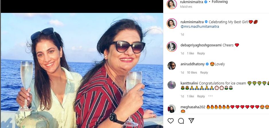 ব্যস, দেব ও রুক্মিণীর ইনস্টাগ্রাম পোস্টকে একত্র করে টলিপাড়ায় শুরু গুঞ্জন। আর সেই গুঞ্জনে পারদ ঢালল রুক্মিণীর মায়ের ছবি। ইনস্টাগ্রাম পোস্ট দেখে বোঝাই যাচ্ছে, রুক্মিণী ও তাঁর মাকে সঙ্গে নিয়েই মালদ্বীপে উড়ে গিয়েছেন দেব। অনুরাগীরা মনে করছেন, খুব শীঘ্রই হয়তো বিয়ের সানাই বাজবে দেব ও রুক্মিণীর পরিবারে। আর এই মালদ্বীপ ট্রিপ সেটারই যেন ইঙ্গিত!