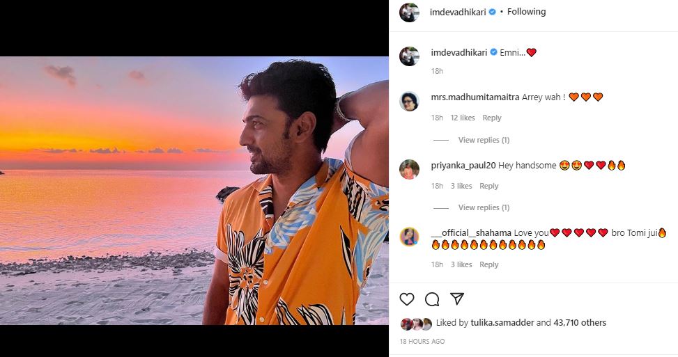 ব্যাপারটা একটু খোলসা করে বলা যাক। সম্প্রতি দেবের ইনস্টাগ্রাম প্রোফাইলে দেখা গিয়েছে, নীল সমুদ্রের সামনে দাঁড়িয়ে ছবি আপলোড করেছেন অভিনেতা। ছবি দেখে বোঝাই যাচ্ছে, মালদ্বীপের সমুদ্রতটে দাঁড়িয়েই ক্যামেরার সামনে পোজ দিয়েছেন দেব। ঠিক একইরকম ছবি দেখা গিয়েছে, দেবের বান্ধবী রুক্মিণী মৈত্রর প্রোফাইলেও। এমনকী, রুক্মিণী শেয়ার করেছেন মায়ের সঙ্গে ছবি ও ভিডিও। সেই ভিডিও দেখা গিয়েছে, মালদ্বীপে মায়ের ৬০ তম জন্মদিন পালনে ব্যস্ত রুক্মিণী।