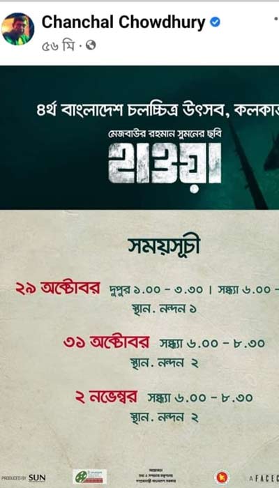 ‘হাওয়া’ দেখানো হবে ৩১ অক্টোবর ও ২ নভেম্বর, নন্দন – ২’এ। দু’দিনই সন্ধে সাড়ে ৬টা থেকে শো। প্রথম দিনের ভিড়েই লুকিয়ে আগামীর সংকেত। তবে নন্দন-২ তুলনামূলক ছোট প্রেক্ষাগৃহ। আগেভাগে হলে পৌঁছে কতজন সেখানকার আসন দখল করতে পারেন, তার জন্য প্রতিযোগিতা শুরু হয়ে যাচ্ছে বইকি। এই ছবি যেন নতুন করে দুই বাংলার সাংস্কৃতিক বন্ধন আরও দৃঢ় করল। আর চঞ্চল চৌধুরী হলেন এপারের চলচ্চিত্রপ্রেমীদের প্রাণের মানুষ।