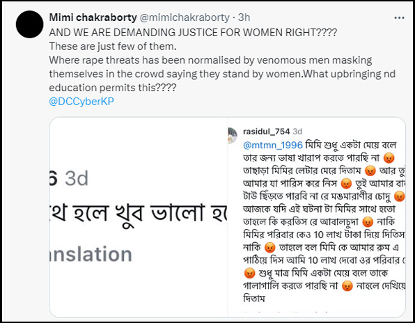 এই পোস্টটি মিমি নিজেই সমাজমাধ্যমে পোস্ট করেন। সেই পোস্টে কলকাতা পুলিশকে ট্যাগ করে যাদবপুরের প্রাক্তন সাংসদ লেখেন, ‘আমরা কী এই কারণেই লড়ছি? আমরা একজন মহিলার জন্য বিচার চাইছি তাই না? ধর্ষণের হুমকি দেওয়াটা যেন জলভাত করে ফেলেছে এরা। তারাই আবার ভিড়ের মধ্যে মিশে বলছেন, মেয়েদের পাশে রয়েছেন! এটা কোন ধরনের শিক্ষা।’ এই হুমকির পর তিনি থানায় অভিযোগ দায়ের করেছেন কিনা জানা যায়নি।