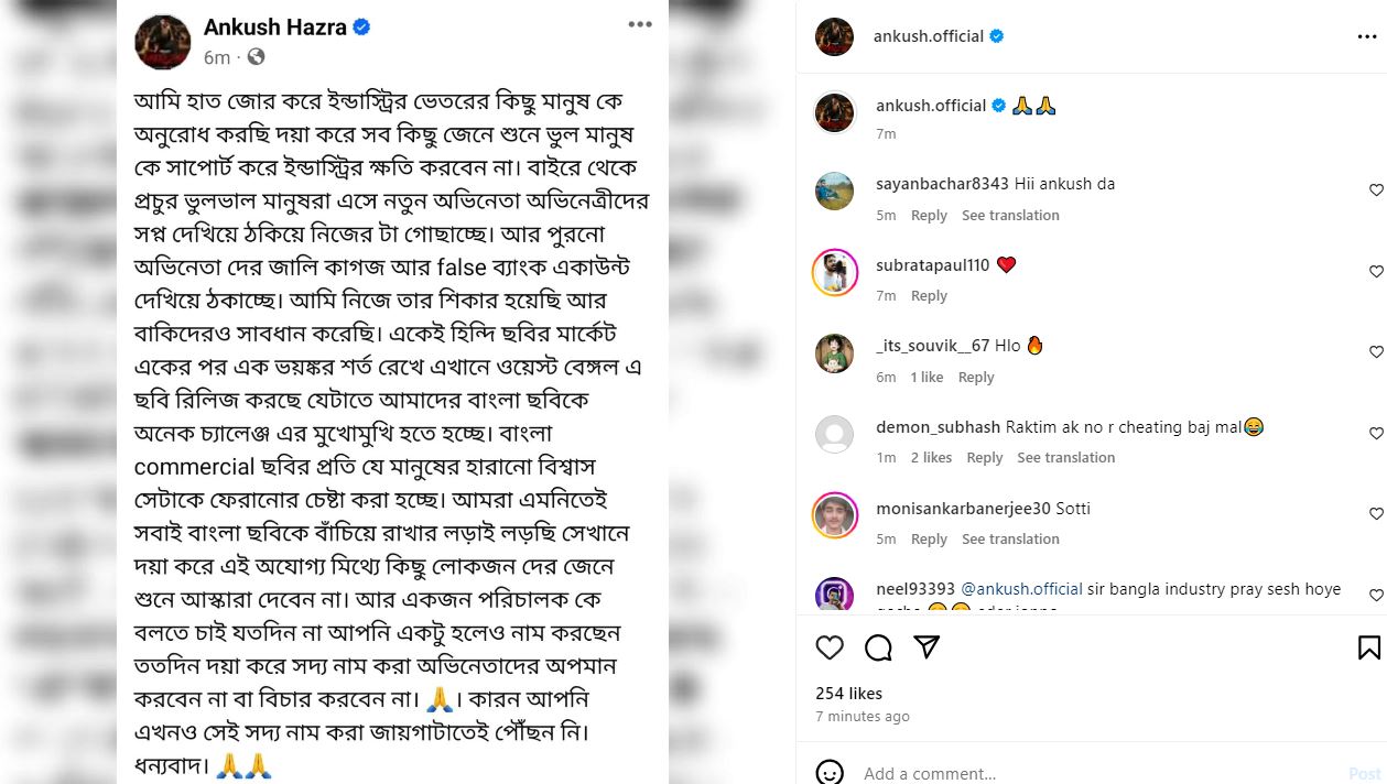 এর পরই আবার তিনি লেখেন, “আমার এক প্রিয় অভিনেতার কথা বলি, সে তো তার সিনেমায় আমার করে দেওয়া টাইটেল লোগোটাই করছে… দেখেও বাজে লাগল.. আমাদের মতো ফেক প্রযোজক রা ফেক ব্যাঙ্ক অ্যাকাউন্ট দেখিয়ে কাজ করতে আসেন তার মানে উনি মানছেন সিনেমার থেকে টাকাটা গুরুত্বপূর্ণ। তাতে সিনেমা হোক বা না হোক, ওনার ফ্যানরা শুনে দুঃখ পাবেন। ওনাদের সাথে কিন্তু গত দেড় বছরে দেখলাম দুটো প্রোডাকশন হাউসের লোগো উঠে গেল, কিন্তু উনি থেকে গেলেন। দিনের শেষে আমরাই SCAMER। তো দাদা আমাদের টাকাগুলো ফেরত দিলে ভালো হয় ( সাথে সোনার ব্রেসলেট, দামি দুটো মোবাইল ফোন)। যাক ছেড়ে দিলাম, বোঝাপড়াটা ইদেই করে নেব। আপনি কী করে ভাবলেন আপনার জন্য ময়দানটা একাই ছেড়ে দেব, সব তুলে রেখেছি। আমি নিজেকে নিয়ে গর্ববোধ করি যে আমার মত তুচ্ছ মানুষকে আটকাতে গেলে আপনাদের ময়দানে নামতে হয়। বাকি কথাটা আপনার আর আমার মধ্যেই রাখা থাকল একসাথে ইলিশ মাছটা ভাগ করে খেয়েছিলাম তো অতটাও নিমকহারাম হতে পারব না, আপনি ভালো থাকবেন। ঈদ ২০২৪-এর যুদ্ধ, ১০০%।”