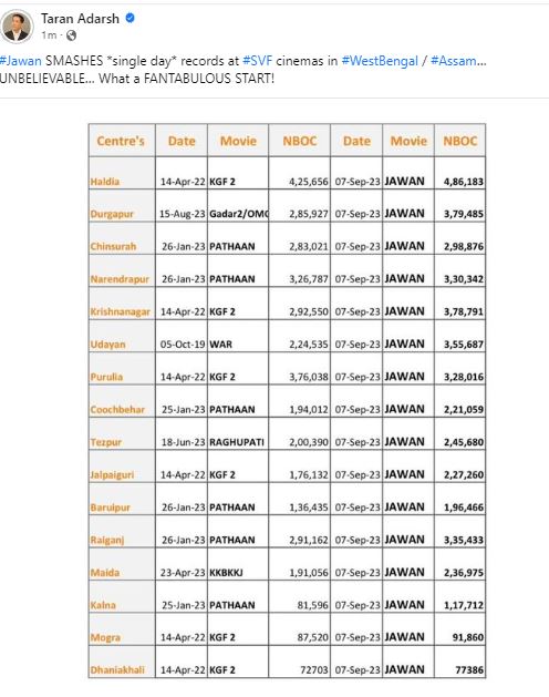 সংবাদ প্রতিদিন ডিজিটাল ডেস্ক: বৃহস্পতিবার ‘জওয়ান’ ছবির মুক্তির দিনই শাহরুখ বুঝিয়ে দিলেন পাঠানের পর ফের বক্স অফিসে রাজত্ব করতে হাজির কিং খান। প্রথম দিনেই গোটা দেশে রেকর্ড ব্যবসা করে ফেলল শাহরুখের জওয়ান। হিসেব বলছে, উইকএন্ডে দুরন্ত গতিতে ছুটবে শাহরুখের এই ছবি।