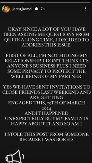 অভিনেতার সংযোজন, “খুব অপ্রত্যাশিতভাবেই বিষয়টা ঘটে গেল। তবে আমার পরিবার খুব খুশি। আর আমিও।” সত্যিই কি দ্বিতীয়বার বিয়ের পিঁড়িতে বসতে চলেছেন অভিনেতা? পোস্টের শেষেই ফাঁস করলেন জীতু। সেখানে লেখা- আসলে আমার খুব একঘেয়ে লাগছিল, তাই এই পোস্টটা অন্য একজনের থেকে চুরি করে নিলাম। বোঝাই যাচ্ছে যে, অভিনেতা আদ্যোপান্ত রসিকতা করেই এই পোস্ট করেছেন।