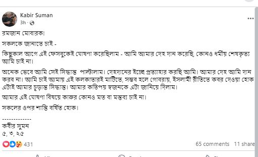 স্বাভাবিকভাবেই কবীর সুমনের এই পোস্ট ভাইরাল হতেই অনুরাগীরা তাঁর শেষ ইচ্ছেকে সমর্থন জানিয়েছেন। প্রসঙ্গত, নব্বইয়ের দশকে সুমন চট্টোপাধ্যায়ের ‘তোমাকে চাই’ অ্যালবাম রীতিমতো ঝড় তুলে দেয়। পরবর্তীতে বাংলাদেশের সঙ্গীতশিল্পী সাবিনা ইয়াসমিনের সঙ্গে সংসার বাঁধার আগে ইসলাম ধর্ম গ্রহণ করেন সুমন। তার পর থেকেই সুমনের নামের আগে যুক্ত হয় ‘কবীর’। এবার তিনি মরণোত্তর শেষ ইচ্ছের কথা জানালেন।