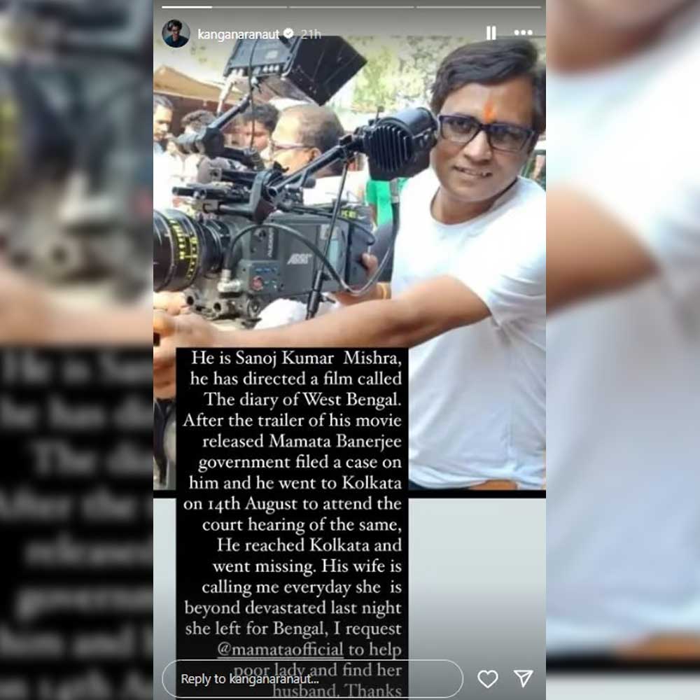 কঙ্গনা তাঁর ইনস্টাগ্রাম স্টোরিতে আরও জানান,“পরিচালকের স্ত্রী রোজ আমাকে ফোন করে চলেছেন। গত রাতে তিনি খুবই ভেঙে পড়েছিলেন। তিনিও পশ্চিবঙ্গের দিকে রওনা দিচ্ছেন। আমি মমতা বন্দ্যোপাধ্যায়কে অনুরোধ করছি এই অসহায় মহিলাকে তাঁর স্বামী সানোজকে খুঁজে পেতে সাহায্য করুন। ধন্যবাদ।”