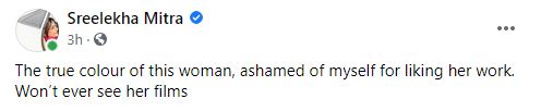 এদিকে দিল্লিতে আন্দোলনরত কৃষকদের সন্ত্রাসবাদী বলায় অভিনেত্রীর বিরুদ্ধে মামলা করেছেন কর্ণাটকের আইনজীবী হর্ষবর্ধন পাতিল। সেই খবর শেয়ার করে অভিনেত্রী শ্রীলেখা মিত্র (Sreelekha Mitra) ফেসবুকে লিখেছেন, “এটাই মহিলার আসল চেহারা, নিজের উপর লজ্জা হয় যে একটা সময় এর অভিনয় ভাল লেগেছিল। আর এর ছবি দেখব না।”