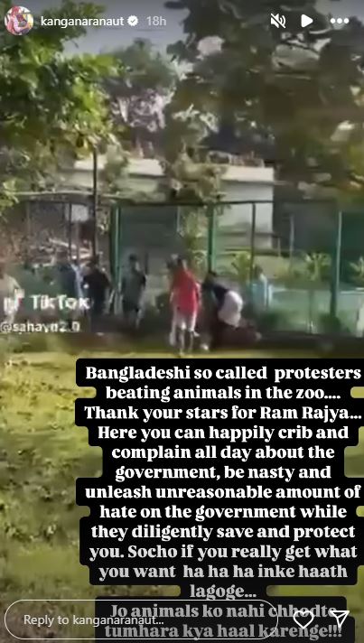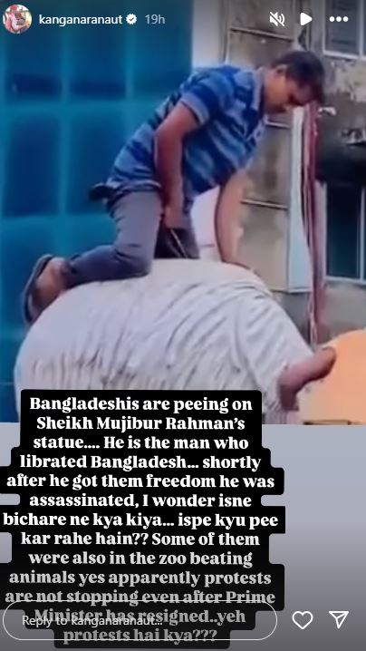 কঙ্গনা আরও লিখলেন, ”বাংলাদেশের কিছু মানুষ শেখ মুজিবুর রহমানের মূর্তির উপর প্রস্রাব করছেন। এই মানুষটাই বাংলাদেশকে স্বাধীন করেছিলেন। তাঁকে হত্যাও করা হয়েছিল। আমি ভাবছি, এই মানুষটা কী না করেছিলেন! ওঁর উপর কেন প্রস্রাব করছেন!” এখানেই থামেননি কঙ্গনা। তিনি লিখলেন, ”কয়েক জনকে দেখলাম চিড়িয়াখানায় ঢুকে পশু-পাখিদের ধরে মারছে। প্রধানমন্ত্রী ইস্তফা দেওয়ার পরেও ওদের প্রতিবাদ থামেনি বোধ হয়! এ কেমন প্রতিবাদ বাংলাদেশে?”