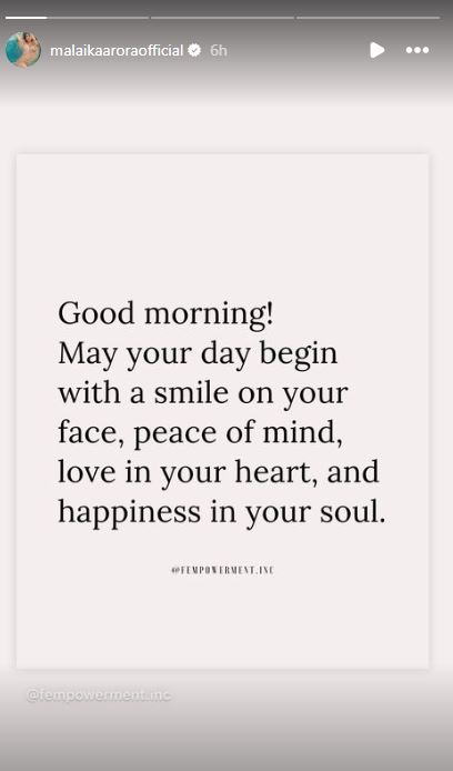 সম্প্রতি ইনস্টাগ্রামে মালাইকা একটা স্টোরি পোস্ট করেছেন। যেখানে তিনি লিখলেন, ”সুপ্রভাত, দিনের শুরু হোক একমুখ হাসি, মনের শান্তি এবং বুক ভরা ভালোবাসা এবং আনন্দকে সঙ্গে নিয়েই।”