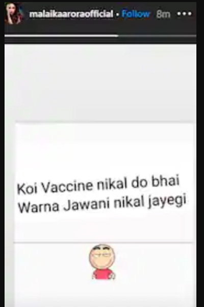 ইনস্টাগ্রাম স্টোরিতে লিখেছেন, “কেউ করোনার ভ্যাকসিনটা বের করো রে বাবা, নাহলে আমার যৌবনটাই ফুরিয়ে যাবে মনে হচ্ছে!…” এর সঙ্গে একটি মজার ইমোজিও জুড়েছেন মালাইকা। তবে এই পোস্ট রসিকতার নজরে দেখলেও অনেকেই বলছেন যে, মারণ ভাইরাসের রোষে পড়েও কিন্তু মনের জোর ঠিক রেখেছেন মালাইকা। নইলে কী আর এরকম পোস্ট সম্ভব?