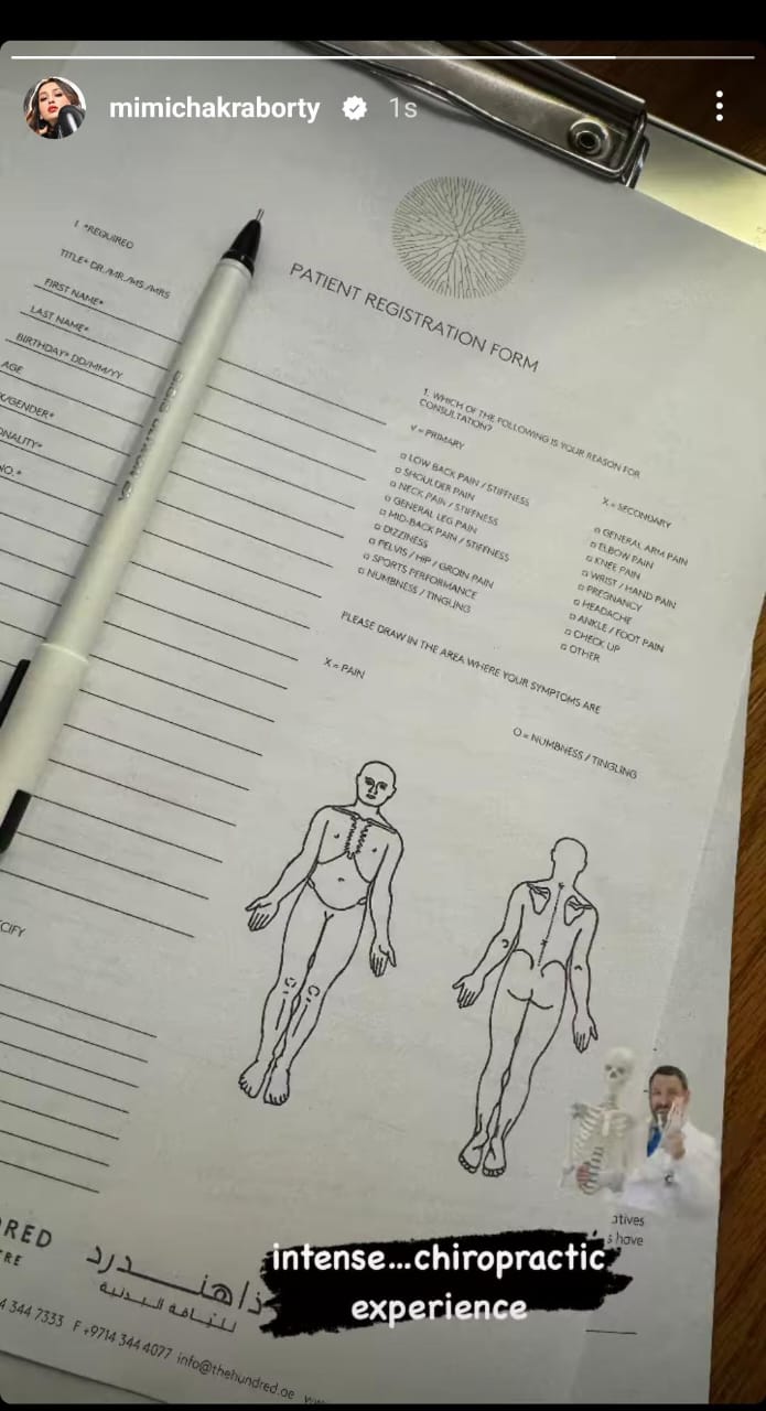 কাইরোপ্র্যাকটিক থেরাপি করার আগে ফর্ম ফিলআপ করছেন মিমি। আর সেটা দেখেই অভিনেত্রীর অসুস্থতা নিয়ে অনুরাগীদের কপালে ভাঁজ পড়েছে। এই কাইরোপ্র্যাকটিক থেরাপি মেরুদণ্ড, ঘাড়, শরীরের বিভিন্ন পেশী, হাড়ের সন্ধিস্থল নানা সমস্যা সারায়। একটানা কাজের জন্য ক্লান্ত শরীরকে চাঙ্গা করতেই সম্ভবত দুবাইতে এই থেরাপির দ্বারস্থ হয়েছিলেন মিমি।
