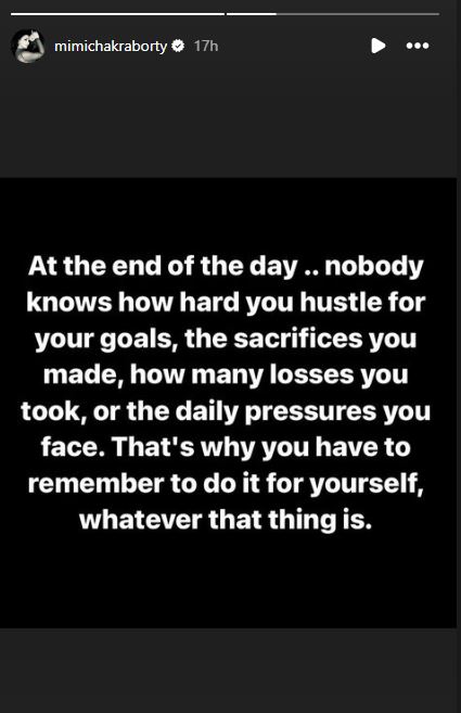 মিমি তাঁর ইনস্টাগ্রামে লিখলেন, ”দিনের শেষে, কেউ জানতেও পারে না নিজের লক্ষ্যে পৌঁছনোর জন্য কতটা বাধা পার করতে হয়। কতটা আত্মত্যাগ করতে হয়। কত কী হারাতে হয়। প্রত্যেকদিন কতটা চাপের মধ্যে থাকতে হয়। তাই এটা মাথায় রাখতে হবে, নিজেকেই সব কিছু করতে হবে। সেটা যাই হোক না কেন।”