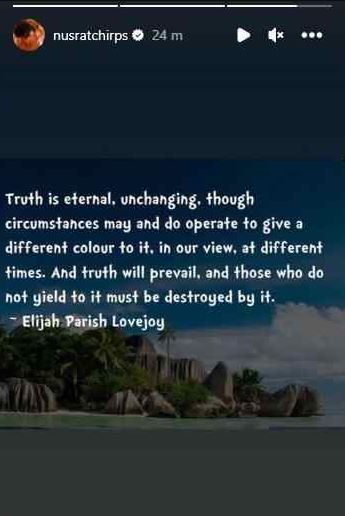 শনিবার নিজের ইনস্টা স্টোরিতে অভিনেত্রীর পোস্ট- “সত্যি চিরন্তন, অপরিবর্তিত। যদিও পরিস্থিতি নির্বিশেষে তাতে রং চড়িয়ে বিকৃত করার চেষ্টা চলে বিভিন্ন সময়ে। তবে সত্যিটা ঠিক সামনে আসবেই। আর যাঁরা এই সত্যিটা বোঝেন না, তাঁরা ঠিক একদিন ধ্বংস হবে।” ফ্ল্যাট দুর্নীতি মামলা, ইডির ব়্যাডারে পড়েই কি সাংসদ অভিনেত্রীর এমন উপলব্ধি? সেই উত্তর যদিও অধরা।