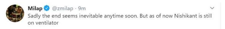 এরই টুইটে মিলাপ লিখেছিলেন, যেকোনও সময় নিশিকান্তের মৃত্যুর খবর আসতে পারে। কিন্তু পরে তা আবার ডিলিট করে দেন।