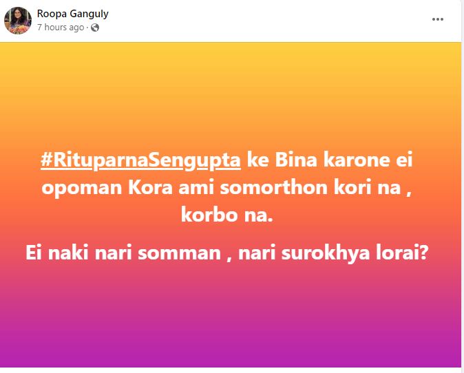 পরিচালক কমলেশ্বর মুখোপাধ্যায় লিখলেন, ”ঋতুপর্ণা সেনগুপ্তর সঙ্গে এই অমানবিক আচরণের বিরুদ্ধে প্রতিবাদ জানাচ্ছি। সবাই আন্দোলনে সামিল হতে পারেন। কেউ কাউকে আটকাতে পারেন না।”