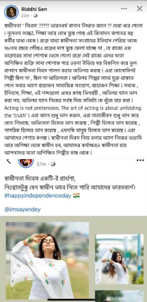 ঋদ্ধির সংযোজন, “এরা কোনও দিনই শিল্পী ছিল না। ছিল না অভিনেতা। অভিনয় শিল্পর সঙ্গে যুক্ত থাকতে গেলে সবার আগে প্রয়োজন সামাজিক সংযোগ, প্রয়োজন শিক্ষা। সমাজ , ইতিহাস, শিক্ষা, এই শব্দগুলো এদের কাছে ভিনগ্রহী, অভিনয় মানে ভান করা নয়, অভিনয় মানে নিজের সর্বস্ব দিয়ে সত্যিটা কে খুঁজে বার করা। ভান করে অভিনয় হয় না। অভিনয়ের অন্য অর্থ সত্যকে উন্মোচন করা।” মধুমিতাকে ‘অশিক্ষিত শিল্পী’ বলে তোপ দেগে ঋদ্ধির মন্তব্য, “এরা জানে শুধু ভান করতে, এরা সারাজীবন শুধু ভান করে যেতে শিখেছে, অভিনেতা হিসেবে ভান করেছে, শিল্পী হিসেবে ভান করেছে, নাগরিক হিসেবে ভান করেছে, এমনকি মানুষ হিসেবে ভান করেছে। এরা আমাদের পেশায় কলঙ্ক। স্বাধীনতা দিবস নিয়ে বলার আগে নিজের ভণ্ডামি আর অশিক্ষা থেকে স্বাধীন হন, আমাদের কর্মক্ষেত্রও স্বাধীনতা চায় আপনাদের মতো অশিক্ষিত শিল্পীর কাছ থেকে।” যদিও সেই পোস্ট আধঘণ্টার মধ্যেই তুলে নিয়েছেন অভিনেতা। এখন সোশাল মিডিয়ায় পোস্টের কোনও অস্তিত্বই নেই। তবে স্ক্রিনশটে ছয়লাপ সোশাল মিডিয়া।