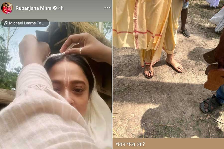 সেই ছবিতে রূপাঞ্জনাকে দেখা যাচ্ছে এক্কেবারে নো মেকআপ লুকে। সাদা শাড়ি, গায়ে গেরুয়া চাদর, মাথায় ঘোমটা ও কপালে তিলক। একইসঙ্গে স্টোরিতে অভিনেত্রী শেয়ার করেছেন পাদুকা পরা একজোড়া পায়ের ছবি। সেই ব্যক্তির মুখ দেখা না গেলেও তিনি যে গেরুয়া বসনে সেজেছেন তা ভালোই বোঝা যাচ্ছে। ওই ছবিতে রূপাঞ্জনা লিখেছেন, ‘খরম পরে কে?’ সত্যিই তো কে এই খরম পায়ে? রহস্য জিইয়ে রেখেছেন পোস্টে অভিনেত্রী। তবে নেটিজেনদের মনে প্রশ্ন জাগছে তাহলে কি এই খরম পরা পা দিব্যজ্যোতির? এর আগে ছোটপর্দায় জনপ্রিয় ধারাবাহিক ‘অনুরাগের ছোঁয়া’তে মা ও ছেলের ভূমিকায় অভিনয় করেছেন রূপাঞ্জনা ও দিব্যজ্যোতি। এবার নাকি এই ছবিতেও তাঁদের মা ও ছেলের ভূমিকাতেই দেখা যাবে বলে গুঞ্জন। যদিও তা নিয়ে মুখ খোলেননি অভিনেত্রী। এমনকী ছবিতে কোন চরিত্রে অভিনয় করছেন তিনি সেই বিষয়েও খোলসা করেননি কিছুই।