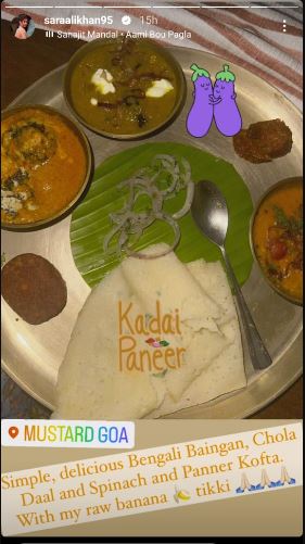 ইনস্টাগ্রামে নবাবকন্যা জানিয়েছেন, “খুব ছিমছাম তবে মুখরোচক বাঙালি বেগুনের সবজি, ছোলার ডাল, পালং শাক এবং কাঁচকলার কোপ্তা, পনির কোপ্তা।” শুধু তাই নয়, রকমারি পদের ছবি শেয়ার করে নেপথ্যে ‘আমি বউ পাগলা’ বাংলা লোকগানটিও দিয়েছেন সারা। যদিও সেই খাবারের থালায় ছোলার ডালের দেখা পাওয়া যায়নি! এছাড়াও সেখানে ঘরোয়া লাউয়ের তরকারি, অরহড় ডাল এবং আলু-ঢেড়শের চচ্চড়িও চেখে দেখেছেন সারা আলি খান। ঝাল খেতে যে তিনি বেশে পছন্দ করেন, তা দেখেই বোঝা গেল।