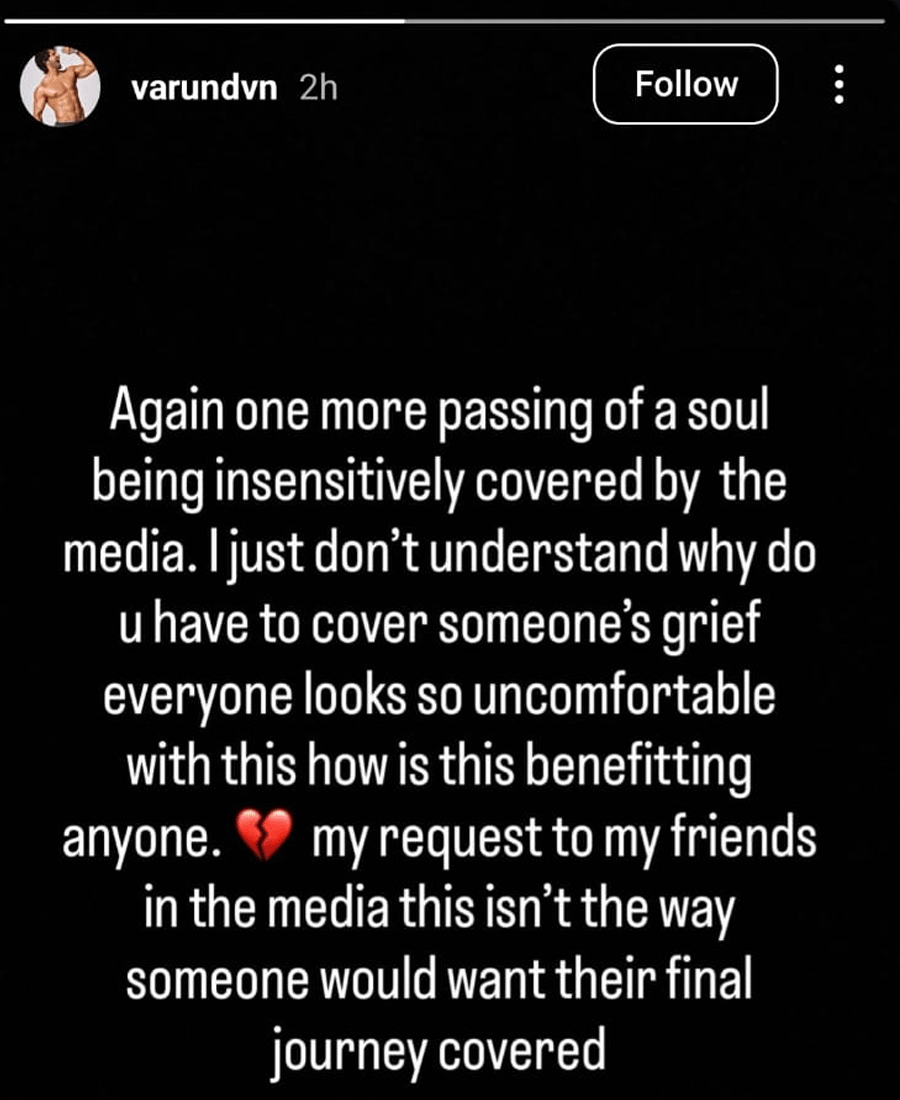 রবিবার নিজের ইনস্টাগ্রামে বরুণ একটি পোস্ট করেন। যেখানে ছিল অসম্ভব ক্ষোভ। সেই পোস্ট দেখেই বোঝা যাচ্ছে যে শেফালির মৃত্যুর খবর করা নিয়ে পাপারাজ্জিদের উদ্দেশ্য করেই তিনি এটি পোস্ট করেছেন। সেখানে বরুণ লিখেছেন, ‘ আবারও, একটি মৃত মানুষের মৃত্যুকে কীভাবে এতটা অমানবিকভাবে খবর করা হল। আমি বুঝি না কেন কোনও তারকা প্রয়াত হলে তাঁর মৃত্যু ও তাঁর পরিবারের শোককে খবর করার এত প্রয়োজন পড়ে? প্রত্যেকেই এর কারণে অপ্রস্তুত হয় পড়েন তবুও একাজ থামেনা। কীভাবে এটা সম্ভব? আমার সংবাদমাধ্যমের বন্ধুদের আমার অনুরোধ কারোর শেষ যাত্রা যাতে এভাবে খবর না করা হয় সেদিকে নজর রাখতে।’