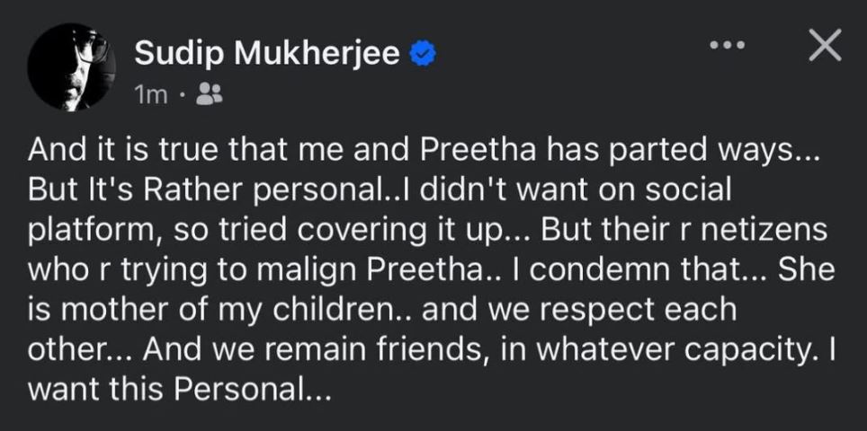সুদীপ রবিবার সোশাল মিডিয়ায় একটি ভিডিও পোস্ট করেন। সেখানেই জানিয়েছিলেন, “প্র্যাঙ্ক করে পৃথা গতকাল একটি পোস্ট করে। ডিভোর্সের কথা লেখে। আমি জানতাম না। কাল শুটিংয়ে ব্যস্ত ছিলাম। বারবার ফোন পাই। ফোন ধরতে পারিনি। সুইচড অফ করে দিয়েছিলাম। বাড়ি ফিরে জানতে পারি ওর পোস্ট নিয়ে এত আলোচনা হচ্ছে।” বিচ্ছেদের জল্পনা পুরোপুরি উড়িয়ে দিয়ে তিনি আরও বলেন, “আমরা একসঙ্গেই আছি। এটা নিয়ে চিন্তা করার কিছু নেই। নেগেটিভ নিউজ নিয়ে বেশি ভাববেন না।” বলে রাখা ভালো, সুদীপের ভিডিও বার্তা শেয়ার করার পরই গতকালের পোস্টটি ডিলিট করে দিয়েছিলেন পৃথা। তবে এবার সত্যিটা দিনের আলোর মতো পরিষ্কার।