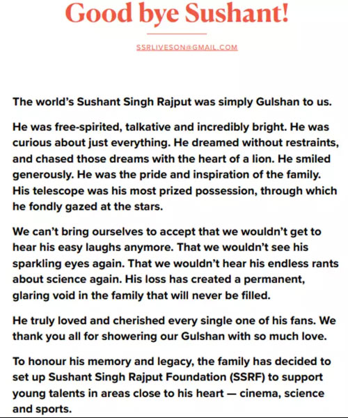 শুধু তাই নয়, সুশান্ত যে বিভিন্নভাবে সমাজসেবাও করতেন, একথা কোনওদিনই সেভাবে প্রকাশ্যে আসেনি। কারণ, অভিনেতা সবটাই করতেন প্রচারের আড়ালে থেকে। প্রিয় ছেলের মৃত্যুর পরও যেন যে কাজ অব্যাহত থাকে, তাই প্রয়াত অভিনেতার নামে ‘সুশান্ত সিং রাজপুত ফাউন্ডেশন’ (Sushant Singh Rajput Foundation) তৈরি করার কথাও ভেবেছে পরিবার।