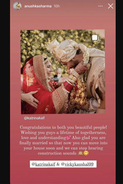 আগেই ভিকি কৌশল আর ক্যাটরিনা কাইফের যৌথ বাসস্থানের কথা শুনেছিলেন অনুষ্কা। অপেক্ষাই করছিলেন, কবে ইন্ডাস্ট্রির সহকর্মীরা প্রতিবেশী হয়ে উঠবেন। বৃহস্পতিবার আনুষ্ঠানিক বিয়ের পর নবদম্পতিকে শুভেচ্ছা জানাতে গিয়ে বেশ মজার পোস্টই করলেন বিরাটপত্নী। ইনস্টাগ্রাম (Instagram) স্টোরিতে তিনি ভি-ক্যাটের বিবাহের একটি ছবি দিয়ে লিখেছেন, ”অভিনন্দন তোমাদের দু’জনকে। আজীবন দু’জন এভাবেই প্রেমে থেকো, বোঝাপড়ার মধ্যে থেকো। আমি আরও খুশি হচ্ছি যে তোমরা এবার নতুন ফ্ল্যাটে এসে নিজেদের ঘর বাঁধবে। আর আমাদের হাতুড়ির ঠুকঠাক শব্দ শুনতে হবে না। আমারই প্রতিবেশী হয়ে তোমরা আসছ।”
