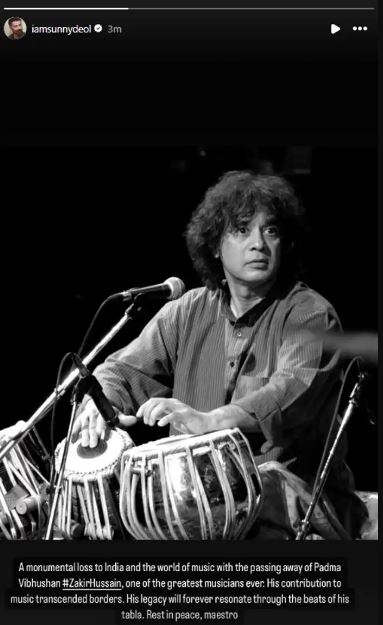 ১০.১৫- ‘গদর’ অভিনেতা সানি দেওল শোকপ্রকাশ করে লিখেছেন, “এই অভাব কোনওদিন পূরণ হবে না। তবলার তালের মধ্য দিয়েই বেঁচে থাকবেন উস্তাদ। পরপারে ভালো থাকবেন জাকির সাহেব।”