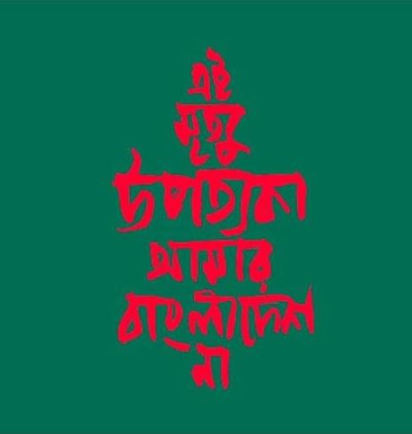 একই ভাবে ছড়িয়ে পড়েছে নবীন গদ্যকার ও শিল্পী সম্বিত বসুর করা একটি ক্যালিগ্রাফি। নবারুণের লাইনটিকে তিনি বদলে নিয়েছেন নিজের মতো করে। ‘এই মৃত্যু উপত্যকা আমার বাংলাদেশ না।’ লেখার হরফের রং লাল। প্রেক্ষাপট সবুজ। যা এক লহমায় চিনিয়ে দেয় প্রতিবেশী দেশের পতাকা। সম্বিত বলছেন, ”এখন কেবলই বলা হয় এখনকার প্রজন্ম পচে গিয়েছে। সেই সময়ে দাঁড়িয়ে এই ঘটনা আমাকে আলোড়িত করেছে। যে কোনও কারণেই হোক, এভাবে এতগুলি তাজা প্রাণের বলিদান মেনে নেওয়া যায় না। অনেকে অবশ্য জানতে চাইছেন ‘আমার বাংলাদেশ’ কেন লিখলাম। আসলে সকলেরই একটা নিজস্ব অনুভব তো থাকে। আমার কাছে যেটা আমার বাংলাদেশ আমি তার কথাই বলতে চেয়েছি এখানে। আসলে স্থানের সীমান্ত থাকে। ভাষার থাকে না।”