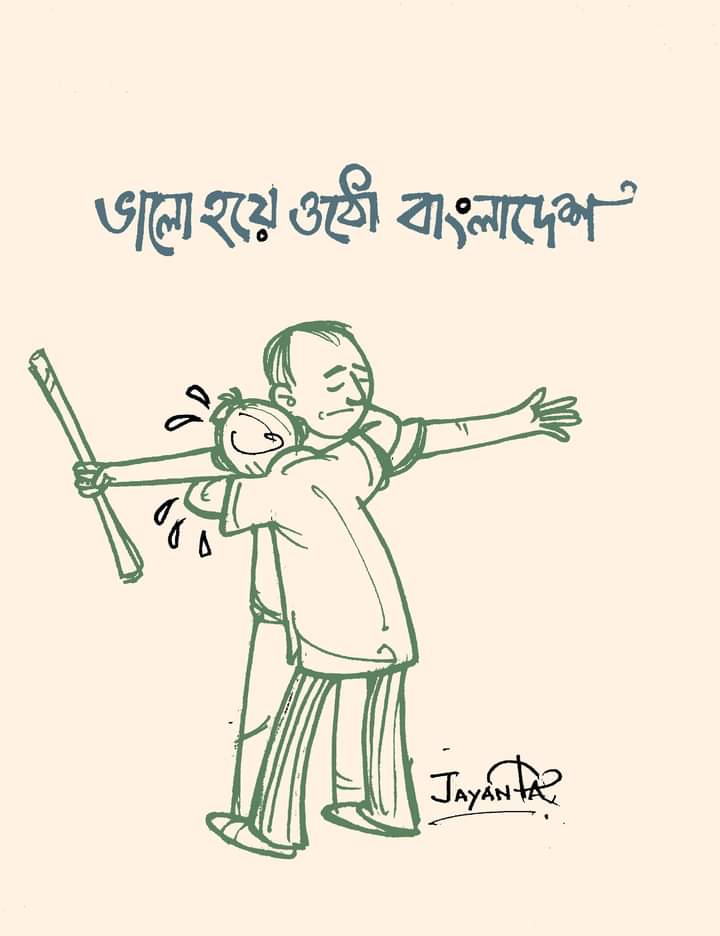 আর এক ছবির শিল্পী জয়ন্ত বিশ্বাস। তাঁর আঁকা ছবিটিও ভাইরাল হয়ে গিয়েছে। সেখানেও আবু সইদের দুহাত বাড়িয়ে রাখা ভঙ্গি। পাশ থেকে একজন জড়িয়ে রেখেছে তাঁকে। কে সে? প্রতিবেশী? যেভাবে পাশের বাড়ির কারও কিছু হলেও আমরা ছুটে গিয়ে সান্ত্বনা দিই, অবিকল সেই ভঙ্গি। জয়ন্তর ছবির ক্যাপশন ‘ভালো হয়ে ওঠো বাংলাদেশ (Bangladesh)’। এবিষয়ে কথা বলতে গিয়ে আবেগপ্রবণ গলায় শিল্পী জানাচ্ছেন, ”এখানে কী সুন্দর রোদে মেঘে একটা দিন! অথচ মাত্র শদুয়েক কিলোমিটার দূরে মানুষ বাড়ি থেকে বেরতে পারছে না। ইন্টারনেটে যা সব দৃশ্য চোখে পড়ছে তাতে মন খারাপ হয়ে যাচ্ছে। এত নেগেটিভের মধ্যে তাই ইচ্ছে হল একটা পজিটিভ কিছু করার। সেখান থেকেই ছবিটা। খুব কাছের কিছু মানুষের কোনও বিপদ হলে যেমন আমরা সান্ত্বনা দিই। কিচ্ছু হবে না। সব ঠিক হয়ে যাবে। সেই ‘মুন্নাভাই এমবিবিএস’ ছবি ‘জাদু কি ঝপ্পি’র মতো। সেরকমই। আর এটা আমি সত্য়িই বিশ্বাস করি সব ঠিক হয়ে যাবে। এবং দ্রুত।”