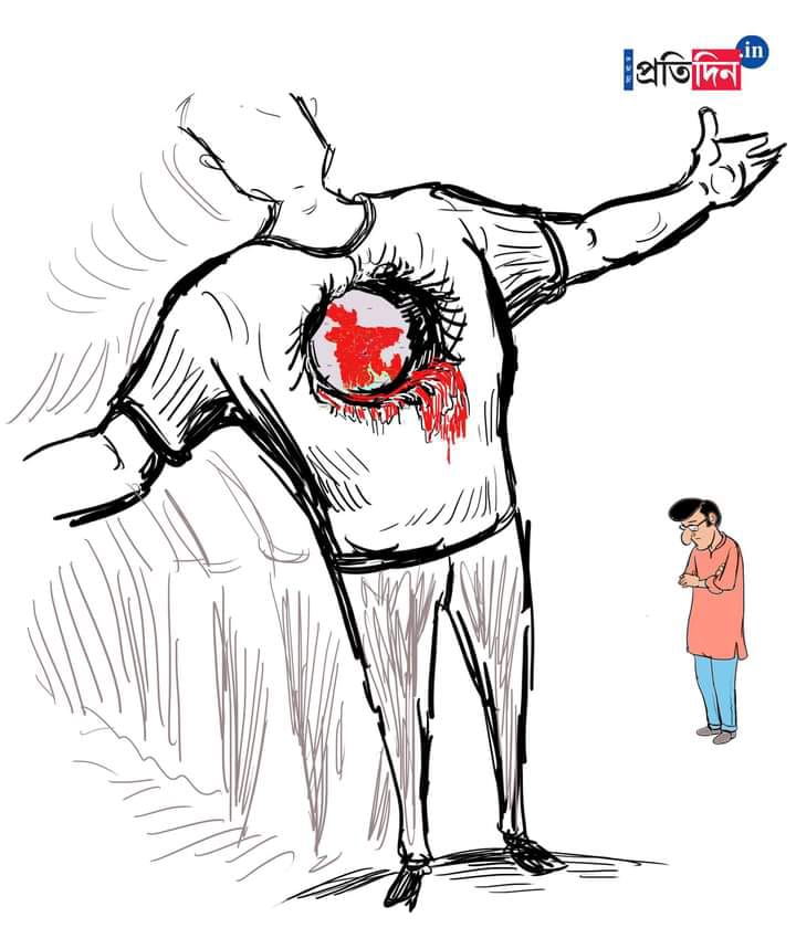 সংবাদ প্রতিদিন.ইন-এ সুযোগ বন্দ্যোপাধ্যায়ের ‘বাঁকাদা’ সিরিজেও বাংলাদেশের বর্তমান পরিস্থিতিই উঠে এসেছে। এই আন্দোলনের প্রতীক হয়ে ওঠা আবু সইদের দুই হাত বাড়িয়ে রাখা ভঙ্গিকেই নিজের মতো করে গড়ে নিয়েছেন তিনি। সেখানে প্রয়াত তরুণের বুকের ভিতরে বাংলাদেশের রক্তস্নাত মানচিত্র ও উপচে পড়া রক্তদাগ তৈরি করছে এক অনন্য অভিঘাত। চরিত্রে বাঁকাদা কার্টুন হলেও এখানে তীর্যকতার চেয়েও গুরুত্ব বেশি পেয়েছে সরাসরি লক্ষ্যভেদী রেখার টান। পাশে দাঁড়ানো নতমুখ বাঁকাদা ছবিটিকে অন্য মাত্রা দিয়েছে। কিন্তু ছবি এঁকে কি এক্ষেত্রে কিছু হবে? এই প্রশ্ন তুলছেন শিল্পী নিজেই। তাঁর কথায়, ”এতগুলো প্রাণ চলে গেল, কিছু তো করতে পারব না এতদূরে বসে। তাই ছবি এঁকেই… কিন্তু সত্য়িই কি কিছু হয় এসব করে? জানি না। এটাই হয়তো শিল্পের সীমাবদ্ধতা। গাজার নিধনযজ্ঞ দেখেও এমনটাই মনে হচ্ছিল। একই অসহায়তা। তবে এটুকু বলতে পারি, এই বলিদান বিফলে যাবে না। অতীতেও যায়নি। এবারও যাবে না।”