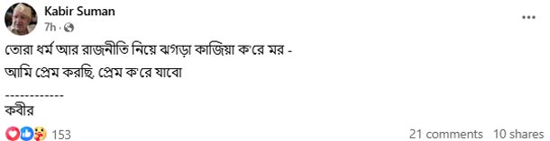 কিন্তু চলতি সপ্তাহে ইসকনের সন্ন্যাসী চিন্ময় কৃষ্ণ দাস ব্রহ্মচারী বা চিন্ময় প্রভুর গ্রেপ্তারি নিয়ে ওপার বাংলায় চূড়ান্ত অরাজক পরিস্থিতি। হিন্দুদের উপর নির্যাতন আরও বাড়ছে। শয়ে শয়ে ইসকন ভক্তকে নিজেদের হেফাজতে নিচ্ছে বাংলাদেশ পুলিশ ও সেনা। সংখ্যালঘুরা সেখানে আতঙ্কের মধ্যে দিন কাটাচ্ছেন। এই পরিস্থিতিতে কবীর সুমনের পোস্টের নিশানায় ঠিক কারা? এ বিষয়ে নানাজনে নানা মন্তব্য করলেও ধর্মীয় মৌলবাদকেই তিনি তোপ দেগেছেন, তা অনেকটাই স্পষ্ট। তাঁর পোস্টের প্রথমাংশ ‘তোরা ধর্ম আর রাজনীতি নিয়ে ঝগড়া কাজিয়া ক’রে মর’ একেবারেই ধর্মে ধর্মে যুদ্ধের বিষয়টিকে নিশানা করছে বলে মনে করা হচ্ছে। তার পরই অবশ্য প্রেমের জয়গান গেয়ে ‘প্রেমিক’ গায়ক বলছেন, ‘আমি প্রেম করছি, প্রেম করে যাবো।’
