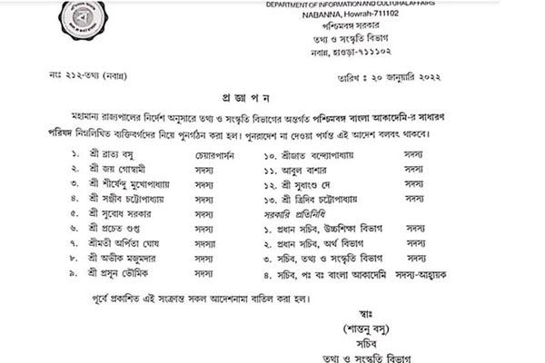 বৃহস্পতিবার তথ্য ও সংস্কৃতি মন্ত্রকের তরফে প্রকাশিত বিজ্ঞপ্তি অনুযায়ী, বাংলা আকাদেমির কমিটিতে ব্রাত্য বসু ছাড়া আরও ১২ জন বিশিষ্টকে আমন্ত্রিত সদস্য করা হয়েছে। এই তালিকায় রয়েছেন –