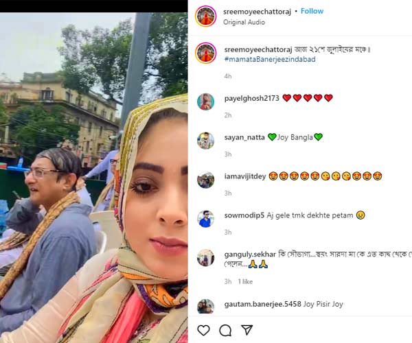 বৃহস্পতিবার একুশে জুলাই উপলক্ষে আয়োজিত অনুষ্ঠানে সামিল হয়েছিলেন তৃণমূলের সমস্ত বিধায়ক, সাংসদ, মন্ত্রীরা। স্বাভাবিকভাবেই অভিনেতা তথা বিধায়ক কাঞ্চন মল্লিকও ছিলেন সেখানে। একুশের অনুষ্ঠান থেকেই এদিন একটি ভিডিও ইনস্টাগ্রামে পোস্ট করেছেন শ্রীময়ী চট্টোরাজ। পাশে দেখা গেল কাঞ্চনকে। এর পাশাপাশি মু্খ্যমন্ত্রীর থেকে উপহার পাওয়া উপহার শাড়ির ছবিও পোস্ট করেছেন তিনি। স্বাভাবিকভাবেই বিষয়টি নিয়ে নানা মহলে শুরু হয়েছে আলোচনা। কারণ, বছর খানেক আগে কাঞ্চন মল্লিকের সঙ্গে তাঁর স্ত্রী পিংকির দাম্পত্য কলহ প্রকাশ্যে চলে এসেছিল। সেই সময় কারণ হিসেবে উঠে আসে শ্রীময়ীর নাম।