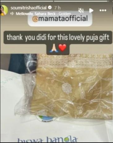 পুজো উপলক্ষে সৌমিতৃষা কুণ্ডুকে একটি সুন্দর শাড়ি উপহার পাঠিয়েছেন মমতা বন্দ্যোপাধ্যায়। মুখ্যমন্ত্রীর তরফে এহেন উপহার পেয়ে উচ্ছ্বসিত মিঠাই। সেই শাড়ির ছবি সোশাল মিডিয়ায় শেয়ার করে ‘দিদি’কে ধন্যবাদও জানিয়েছেন অভিনেত্রী। দেখা গেল বিশ্ববাংলা থেকে ঘিয়ে রঙের একটি শাড়ি পাঠিয়েছেন মমতা। গোটা শাড়িতে সাদা সুতোর কাজ করা। সেই ছবি শেয়ার করে সৌমিতৃষা লিখেছেন, “ধন্যবাদ দিদি, পুজোয় এত সুন্দর উপহার দেওয়ার জন্য।” শুধু সৌমিতৃষা নয়, ফি বছর পুজো উপলক্ষে বিশ্ববাংলা থেকে তারকা, শিল্পীদের উপহার পাঠান মমতা বন্দ্যোপাধ্যায়।