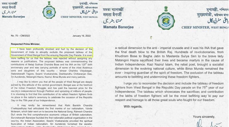 সংবাদ প্রতিদিন ডিজিটাল ডেস্ক: সাধারণতন্ত্র দিবসের (Republic Day 2022) কুচকাওয়াজে স্থান পায়নি বাংলার ট্যাবলো। নেতাজি সুভাষচন্দ্র বসু-সহ একাধিক স্বাধীনতা সংগ্রামী ও তাঁদের সংগ্রামকে থিম করে বানানো ট্যাবলো বাতিল করেছে মোদি সরকার। কেন্দ্রের এই সিদ্ধান্তের পুনর্বিবেচনার আবেদন জানিয়ে প্রধানমন্ত্রী নরেন্দ্র মোদিকে চিঠি দিলেন রাজ্যের মুখ্যমন্ত্রী মমতা বন্দ্যোপাধ্যায়।