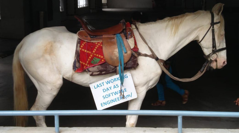 রূপেশের শেষ দিনের কাণ্ডকারকানা এখন ঘুরে বেড়াচ্ছে সোশ্যাল সাইটে। তিনি যা করেছেন তা ভাইরাল হতে দেরি হয়নি। বরং সোশাল সাইটে রূপেশের ছবির ছড়াছড়ি। অবশ্য হওয়ারই কথা। রূপেশ করেছেনই এমন কাজ। চাকরির শেষ দিন তিনি অফিসে গেলেন ঘোড়ায় চেপে। শুধু তাই নয়। সবাইকে জানাতে একটি প্ল্যাকার্ডও লাগিয়েছিলেন তিনি। তাতে লেখা ছিল, “সফটওয়্যার ইঞ্জিনিয়ার হিসেবে শেষ কাজের দিন।” জামাকাপড় তিনি ফর্মালই পরেছিলেন। তারপর সাদা ঘোড়ায় সওয়ার হয়ে অফিস গিয়েছিলেন তিনি।
