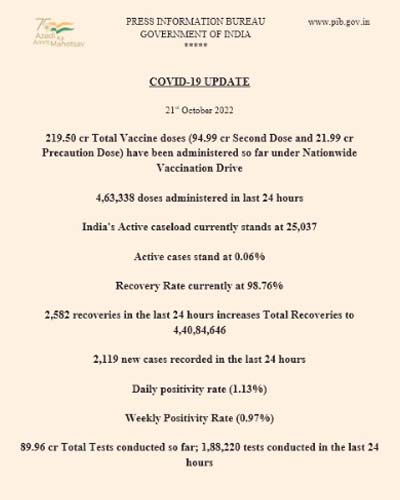 শুক্রবার দেশের স্বাস্থ্যমন্ত্রকের প্রকাশিত বুলেটিন অনুযায়ী, গত ২৪ ঘণ্টায় করোনা ভাইরাসে (Coronavirus) সংক্রমিত হয়েছেন ২,১১৯ জন। বৃহস্পতিবার এই সংখ্যা ছিল ২,১৪১। একদিনে করোনার কবল থেকে সুস্থ হয়ে উঠেছেন ২৫৮২ জন। সুস্থতার হার ৯৮.৭৬ শতাংশ। সক্রিয় করোনা রোগীর সংখ্যা এই মুহূর্তে ২৫ হাজার ৩৭, যা মোট আক্রান্তের তুলনায় ০.০৬ শতাংশ। দৈনিক পজিটিভিটি রেট ১.১৩ শতাংশ। আর সাপ্তাহিক হার ০.৯৭%।