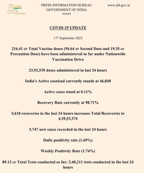 | India reports 5,747 fresh cases and 5,618 recoveries, in the last 24 hours.