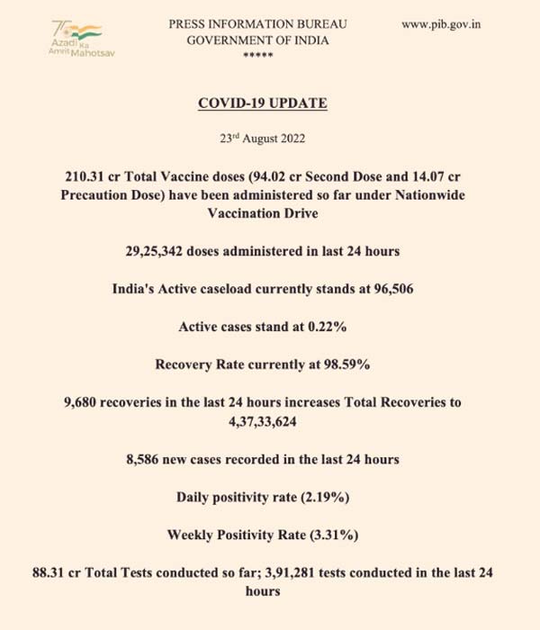 স্বাস্থ্যমন্ত্রকের সাম্প্রতিকতম পরিসংখ্যান অনুযায়ী, গত ২৪ ঘণ্টায় দেশে নতুন করে কোভিড আক্রান্ত হয়েছেন ৮৫৮৬ জন। সুস্থ হয়েছেন ৯৬৮০ জন। শতকরা হিসেবে যা ৯৮.৫৯ শতাংশ। সোমবারও এই হার ছিল একই। অ্য়াকটিভ রোগীর সংখ্যা কমে দাঁড়িয়েছে ৯৬ হাজার ৫০৬-এ। সোমবারও যা ছিল ৯৭ হাজারের বেশি। পজিটিভিটি রেট এই মুহূর্তে ২.১৯ শতাংশ।